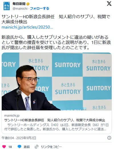 サントリーHD新浪会長辞任 知人紹介のサプリ、税関で大麻成分検出
