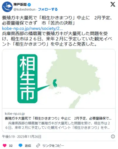 【兵庫】養殖ガキ大量死で相生かきまつり中止