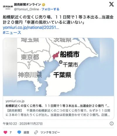 【千葉】船橋駅近くの宝くじ売り場、11日間で1等3本出る…当選金計20億円「幸運の風吹いている」
