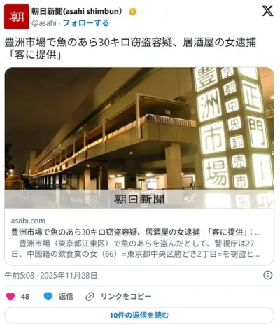 豊洲市場で魚のあら30キロ窃盗容疑、居酒屋の女逮捕 「客に提供」