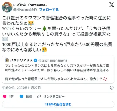 タワマン住人「ギャーッ管理費でクリスマスツリー買ってる!!うちは子供居ないのに!!