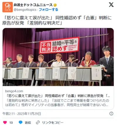 「怒りに震えて涙が出た」 同性婚認めず「合憲」判断に原告が反発 「差別的な判決だ」