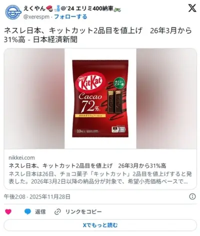 【円安】キットカット値上げ 一部の「10枚入りパック」千円超え 3月から