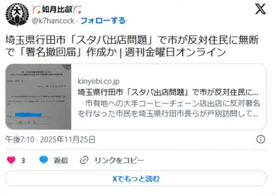 埼玉県行田市「スタバ出店問題」で市が反対住民に無断で「署名撤回届」作成か