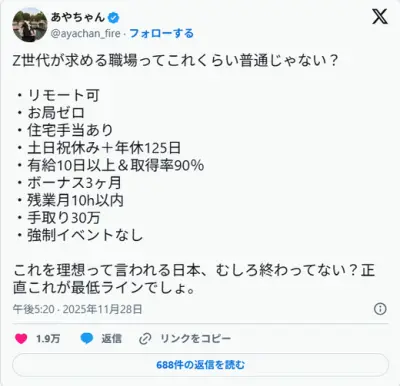 Z世代「手取り月30万・リモート可・年休125・残業10h未満。これが最低ライン」 日本企業震える