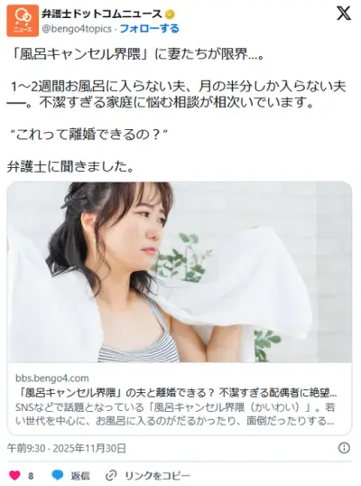 「風呂キャンセル界隈」の夫と離婚できる? 不潔すぎる配偶者に絶望する妻たちの切実な声