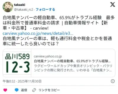 白ナンバーの軽自動車、「普通車料金を請求された」「嫌がらせされた」等のトラブルが多発