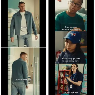 フリーマン「やぁカナダの子供たち!」キッズ「帰れ!このお調子者!」「レッツゴーブルージェイズ!」