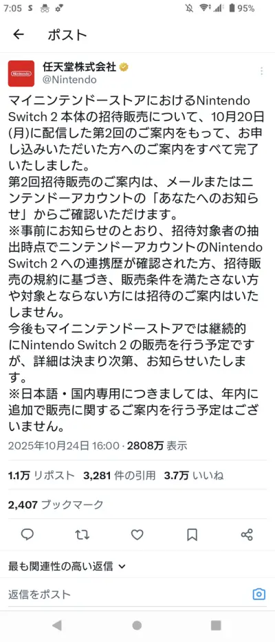 任天堂「公式で応募した人、全員Switch2買えます!!」