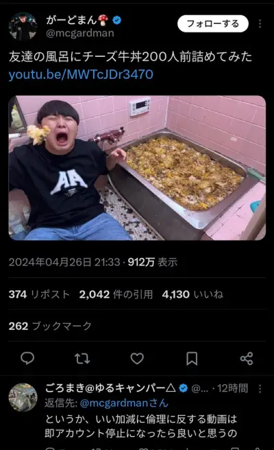 【悲報】YouTuber「友達の風呂にチーズ牛丼200人前詰めてみた」👈食べ物を粗末にするなと大炎上
