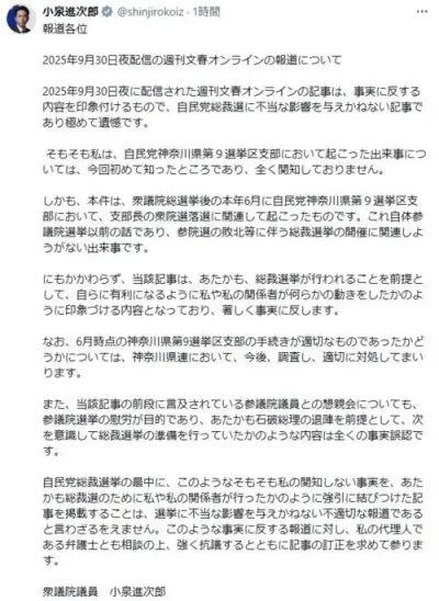 【悲報】小泉進次郎さんが文春報道に抗議「初めて知ったところであり関与もしてない」