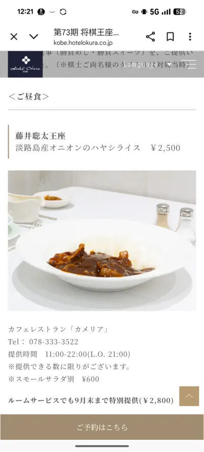 藤井聡太、昼食にホテルオークラのハヤシライス2500円(ドリンク、サラダ別)