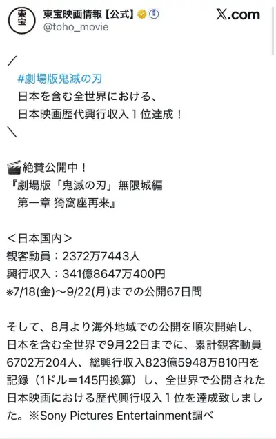 【朗報】鬼滅の刃無限城編、世界で公開された日本映画の歴史興行収入1位になる