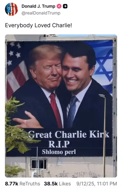 【画像】トランプ、チャーリー・カークの巨大ポスターを作ってご満悦wwww