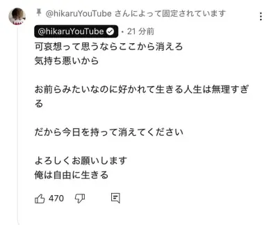 ヒカルさん、アンチを煽るもリュウジさんに登録解除コメされこっそりコメント削除