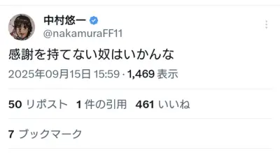 【悲報】中村悠一さん、感謝を持てないやつはいかんなと意味深なポストを投稿
