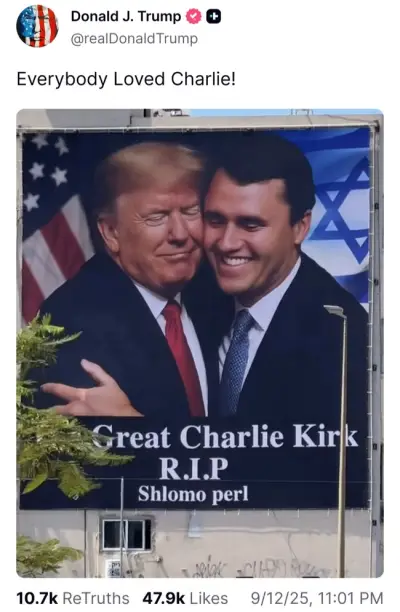 【画像】トランプ大統領、チャーリー・カークの巨大ポスターを作ってご満悦wwww