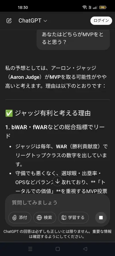 【悲報】AI「ア・リーグMVPはアーロン・ジャッジの方がローリーよりも現時点では優勢である。」