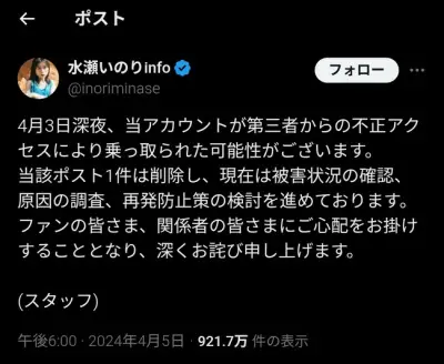 【超悲報】水瀬いのりさんのXアカウント、何者かに乗っ取られる