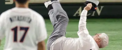 都市対抗の始球式で日立製作所の社長が日立市長にぶち当てる