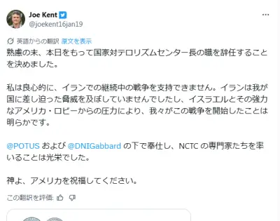 トランプ政権のテロ対策のトップが辞任「この戦争はイランに非はなくアメリカが始めた」