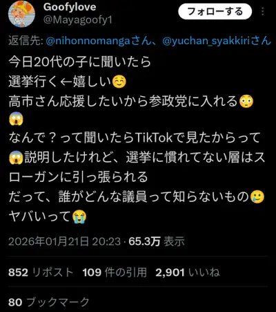 【悲報】「高市さんを応援するなら参政党」とかいうトンデモ情報、TikTokで大拡散されてしまうwwwwww