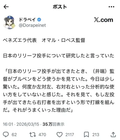 【悲報】ベネズエラ監督「日本の継投が全く分析的じゃなくて逆に驚いた」