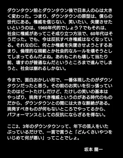 坂本龍一「ダウンタウンのお笑いって『どんくさい奴をイジメて何が悪い』ってことでしょ」