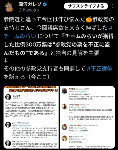 参政党支持者、チームみらいに300万票を不正に盗まれたと騒ぎ始める