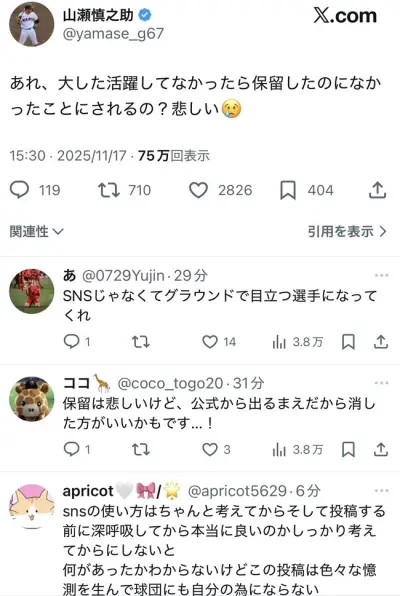 【悲報】巨人山瀬、なんか球団と揉めてる模様。SNSに投稿