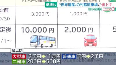 世界遺産がある白川村「駐車料金値上げするで。二輪500円、普通車2000円、バス10000円やで」