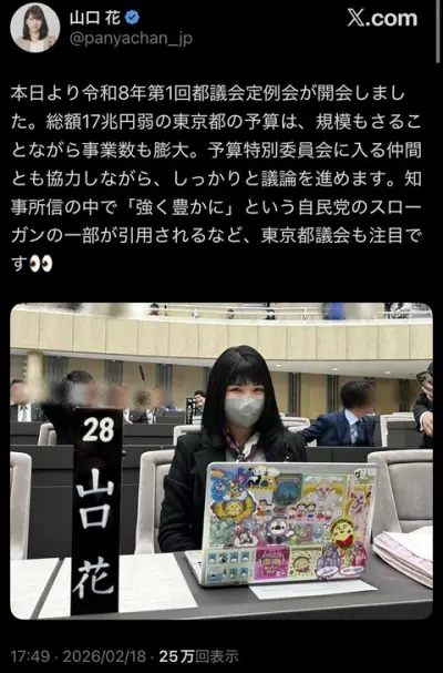 【画像】美人都議さん、ノーパソにシールをベタベタ・114514ネタ投稿で炎上
