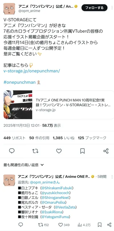 【炎上】ホロライブ、今度はワンパンマンとコラボして炎上してしまう。もう叩いてる奴がヤバいだろこれ