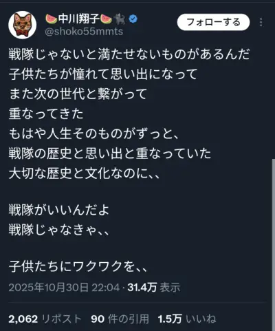 【画像】中川翔子さん「スーパー戦隊終了とか許せない!」→1週間後