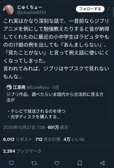【悲報】ジブリさん、日本でサブスク解禁しないせいでZ世代が全く知らない映画になってしまう