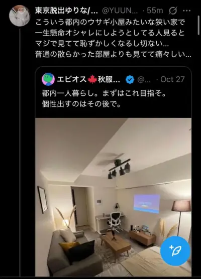 【画像】X女「ウサギ小屋みたいな狭い部屋をお洒落風にしてる東京都民の部屋、見てて痛々しい」都民ブチギレwww