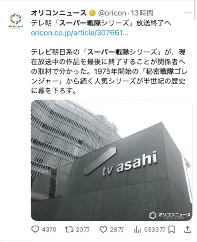 【画像】スーパー戦隊放送終了の記事、わずか半日でインプレッション5000万超えの大荒れ w w w w w w w w w