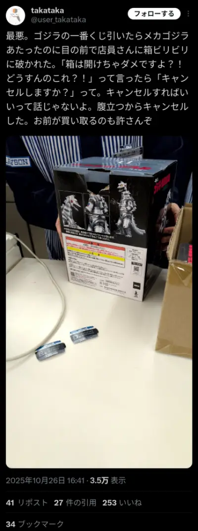 【悲報】X民「一番くじでメカゴジラが当たった!わーい」→店員「ベリベリ」突然箱を破き出すwwwwwwwww
