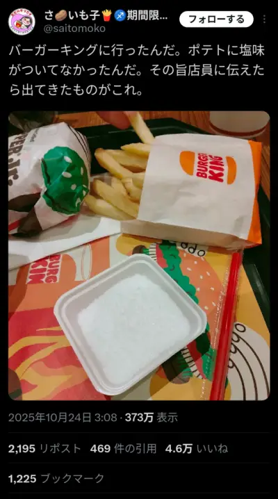 【画像】バーガーキングさん、「ポテトに塩付いてないんだけど」と指摘した客にとんでもない嫌がらせをするwwwwwwwwww