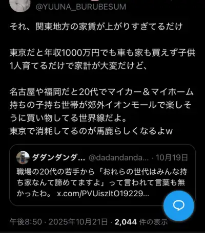 【炎上】X女性「生活が苦しくて持ち家なんて無理?それ関東が家賃高いだけ。地方では20代で家建ててるよ」