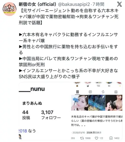 日本の有名インフルエンサーさん、中国で逮捕され死刑になりそうだと話題に