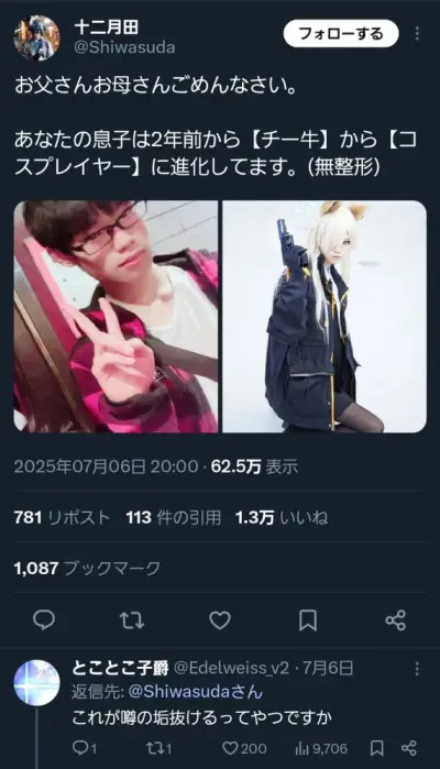 【画像】元チーズ「お母さんごめんなさい。あなたの息子はチーズからコスプレイヤー(無整形)に進化してしまいました」10万いいね