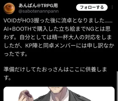 TRPG参加者「立ち絵にAI使っていい?」鯖管「ダメです」参加者「じゃBOOTH使います」鯖缶「返す言葉をなくしました」→鯖削除