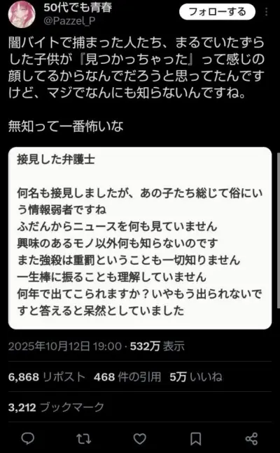 【悲報】強殺で捕まった闇バイト「何年で出られますか?」 弁護士「もう出られません」→絶望へ