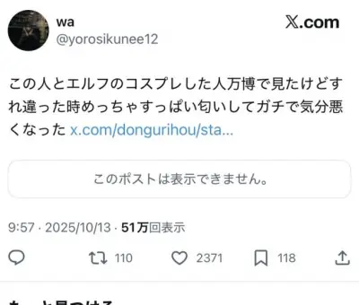 X民「万博でエルフのコスプレした人とその取り巻きに遭遇したけど酸っぱい匂いがした」→あの人が反応して炎上