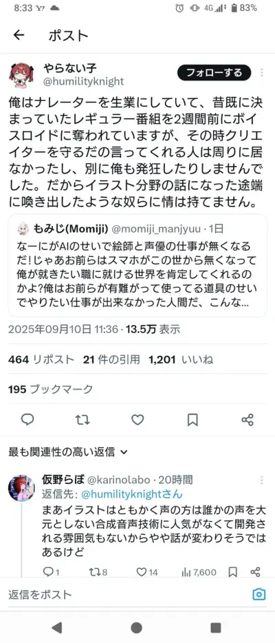 【悲報】元ナレーター「ナレーターの職をボイロに奪われた時は何もしてくれなかったのに絵のAIだけ騒がれるのおかしくね」