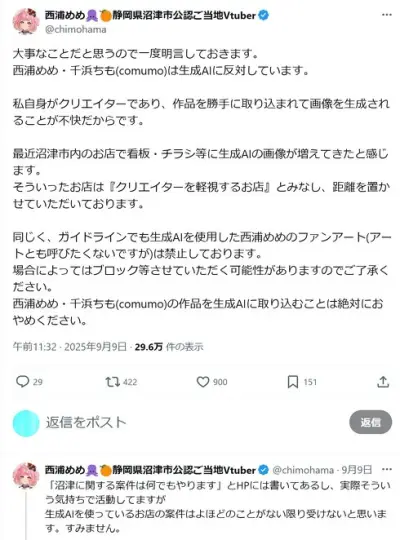【悲報】沼津市公認Vtuber「生成AIを利用し『クリエイターを軽視する地元商店』は距離を置かせていただきます」発言が物議
