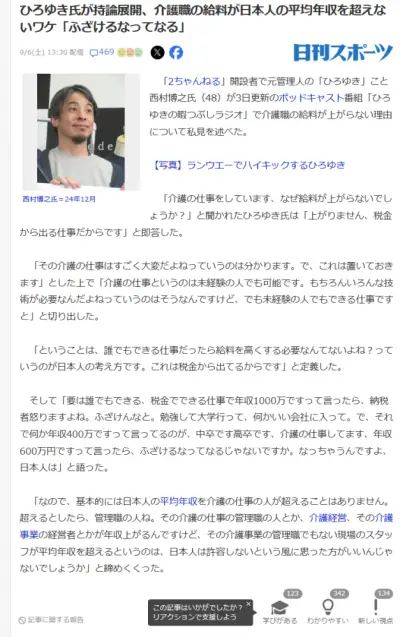 【悲報】ひろゆき「介護職の給料が安いのは、誰でもできる、税金でできる仕事だから」