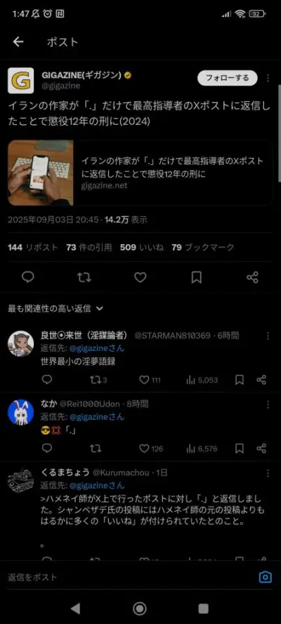 【悲報】イラン人の作家が「.」の投稿で懲役12年へ…