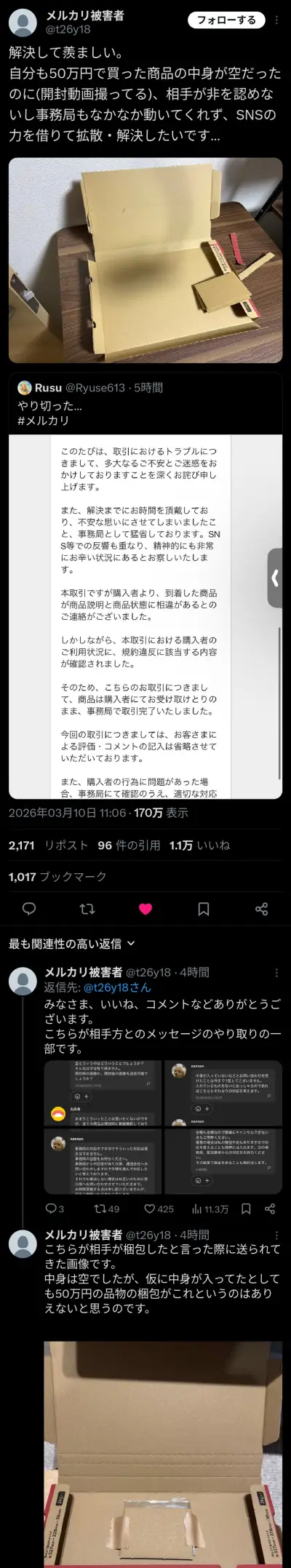 【悲報】X民「メルカリで50万円のポケカ買おー」→中身空っぽの段ボールが送られてくる→メルカリ対応無視www